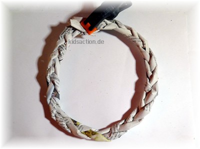- Dann die Zeitungsrollen zu einem Kranz flechten