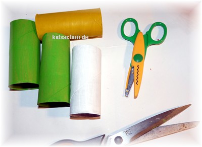 - Inzwischen bemalt 12 Klorollen von innen und von außen mit hellgrüner Farbe