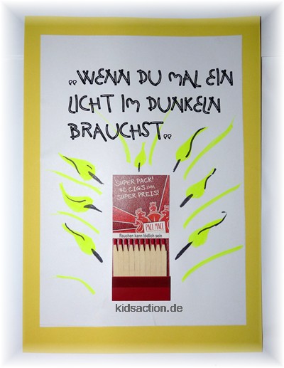 - und doch wird sie dem Beschenkten ein Lächeln auf die Lippen zaubern. Mit einem Marker hab ich hier kleine Flammen um die Streichhölzer aufgemalt