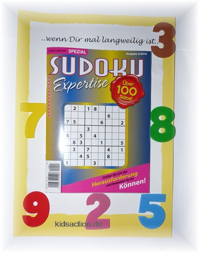 - Sudoku oder wer lieber rätselt, ein kleines Rätselheft verspricht hier Abhilfe. Verziert, hab ich das Sukokuheft mit großen Moosgummizahlen, angeordnet wie in einem Sudokurätsel.