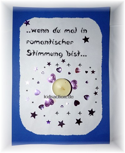 - Beim Ausdruck des Spruches wurden hier schon kleine Sternchen mitgedruckt, Zusätzliche Pailettensterne und Strassherzen rahmen das kleine Teelicht ein.