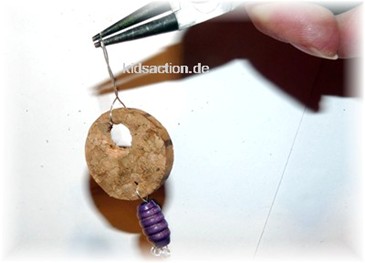 - Zuletzt die kleinen runden Perlen in das große Loch leimen/drücken