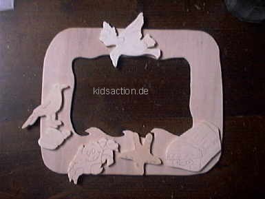 - Übertragt den Rahmen, sowie die Truhe, den Krebs, den Stern und die Möwen auf das Sperrholz