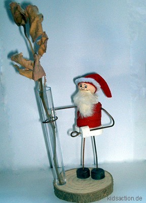 - dann den Nikolaus so auf die Astscheibe kleben, dass das Reagenzglas im Haltearm gleichzeitig auf die vorgebohrte Mulde trifft