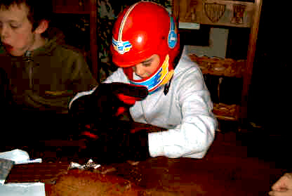 Alle Spieler versammeln sich um den Tisch, auf dem Tisch liegen die Accessoirs. Nun wird reihum gewürfelt. Wer eine 6 hat, darf sich Helm, Mütze und Handschuhe anziehen und mit Messer und Gabel Stück für Stück von der Würstchenkette abschneiden und essen. Derweil würfeln die anderen eifrig weiter. Sobald ein anderer eine 6 gewürfelt hat muss der "Esser" sofort aufhören und die Kleider ect abgeben. Dabei ist es egal, ob er schon zum Essen gekommen ist oder nicht. Das Spiel ist zu Ende, wenn die Miniwürstchenkette/Schokolade aufgegessen wurde (also die Länge nach Anzahl und Hunger der Spieler wählen). Die Belohnung hat ja jeder Spieler direkt bekommen ;-)