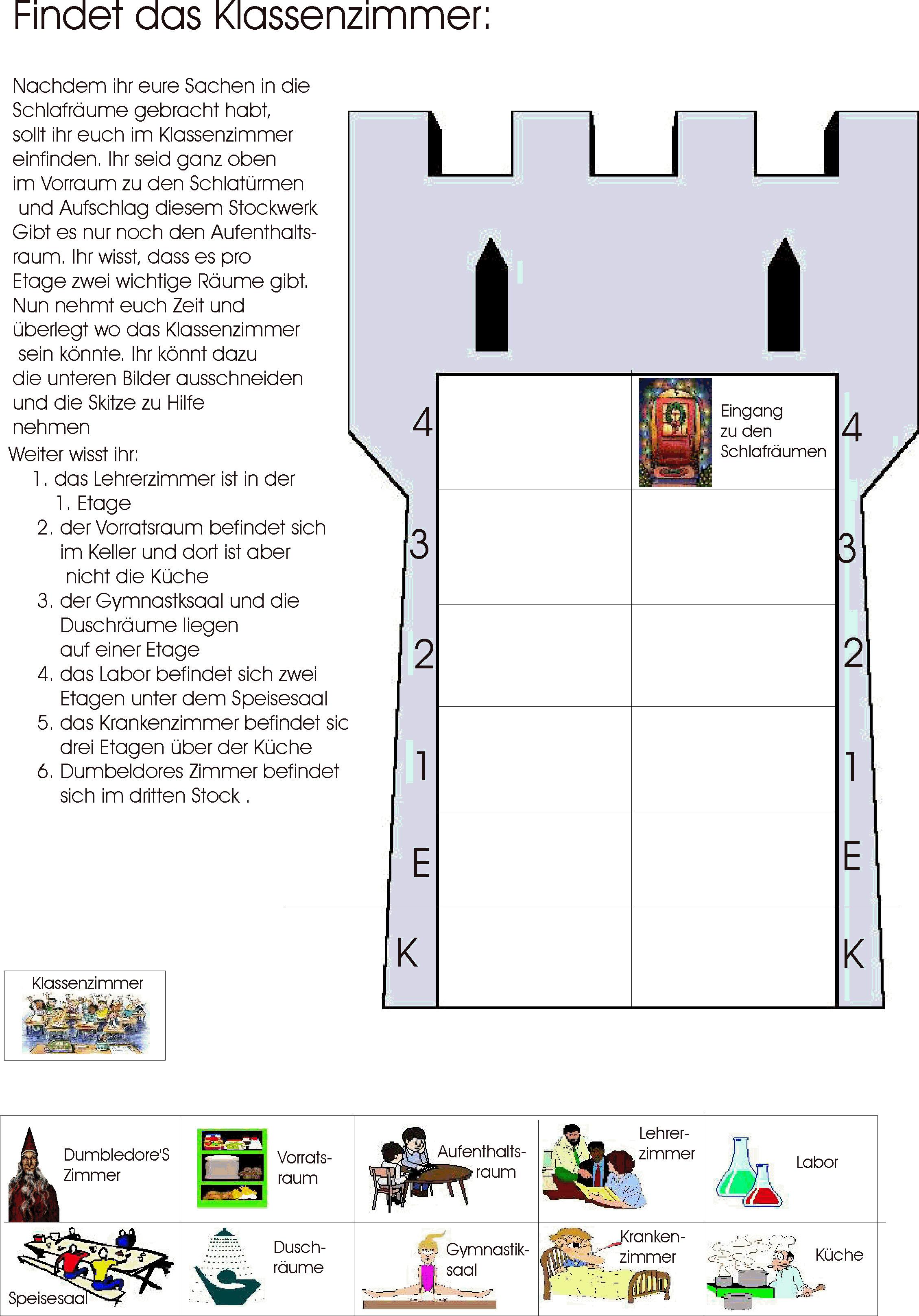 Je nach Alter sollte die Aufgabe einzeln oder im Team gelöst werden. Die Zeit für die Aufgabe könnt ihr auf 15 min festlegen oder individuell bis die ersten gelösten Blätter vorliegen. Für die Lösung sollten die Zimmer in den Turm geklebt werden.