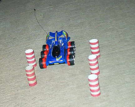 Stelle die Rollen im solchem Abstand von einander auf, dass das Auto noch gut hindurch passt. Nun muss jedes Kind versuchen dort hindurch zufahren und zurück ohne eine Rolle umzufahren oder seinen Standplatz zu verändern. (Wichtig beim Zurückfahren muss so spiegelverkehrt gelenkt werden)