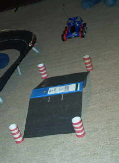 Klappe den Ordner auf und lege ihn so hin, dass eine Rampe mit zwei Auffahrten entsteht. Vor die Auf- bzw Abfahrt stellt du jeweil wieder zwei Rollen. Da der Ordner sehr glatt ist, muss das Hinderniss mit Schwung überquert werden. Dabei dürfen die Rollen nicht umgefahren werden.